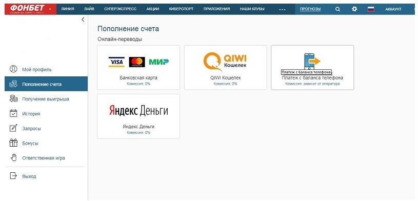 "Фонбет" славится большим количеством поддерживаемых платёжных систем. Среди них есть все самые популярные платёжные системы (Виза, Мастеркард, "Яндекс Деньги"). Возможно пополнение счёта с баланса сим-карты мобильного оператора и даже Apple Pay.